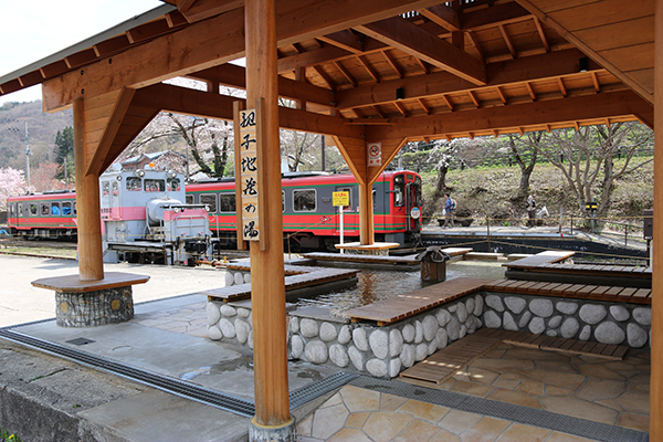 第2天,在东武日光站乘坐9点23分发车的电车,约2小时后可到达汤野上温泉站。茅草屋顶的车站旁边有足浴温泉,除了星期三上午外,均可免费使用。建议您一定要去试一试。