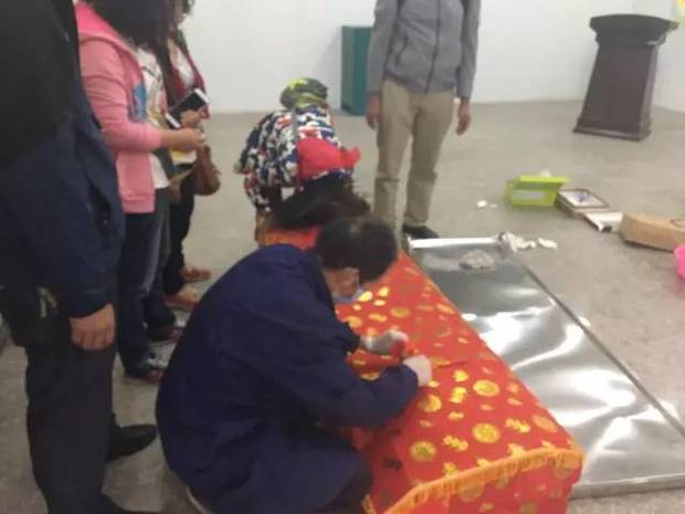 木文胜遗体火化前,和学英与他告别。 图 / 卫诗婕