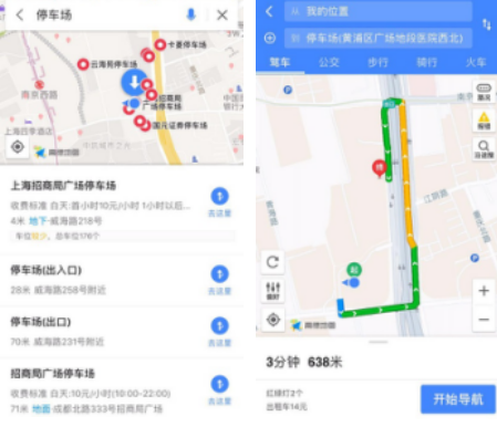 当您使用高德地图导航时,在即将抵达目的地前,高德地图会通过语音自动提示您:“已经找到终点附近停车场,是否导航?”同时在手机屏幕上将目的地附近的停车场信息呈现出来。只需点击导航屏幕来选择,高德便会准确地将您导航到选中的停车场。