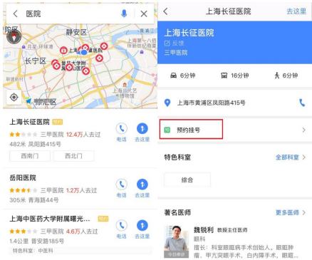 使用相同的方法还可以查询到所在位置附近所有医院的距离、电话等信息,同时还能查看到医院资质、特色科室以及著名医师介绍。此外,高德地图还提供部分医院的“预约挂号”功能,真正做到争分夺秒,节省最宝贵的时间!