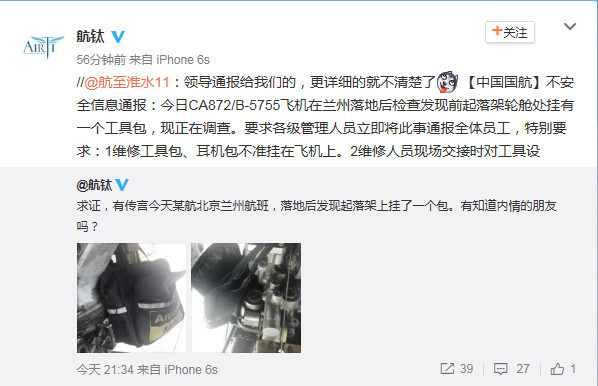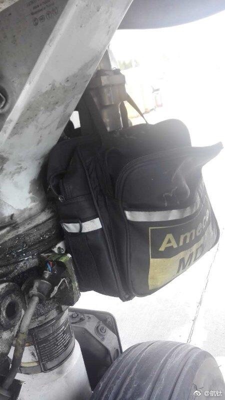今日CA872/B-5755飞机在兰州落地后检查发现前起落架轮舱处挂有一个工具包。