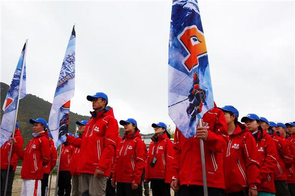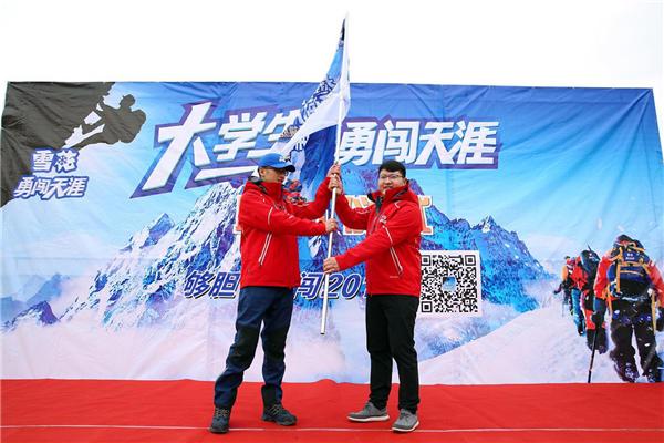 在现场进行了别开生面的授旗仪式,当大学生代表接过锦旗的那一刹那,有一种“山高我为峰,不达目标不罢休”的神圣使命感已激荡起大学生们心中的热血。在场的24名勇闯勇士共同表示,不抛弃不放弃,团结一致,完成未登峰的挑战与自我突破。在接过队旗、庄严宣誓之后,勇士们在轰鸣的礼炮声中向目的地进发。