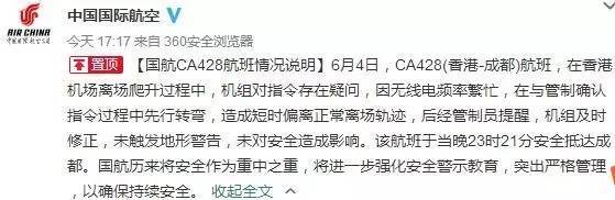 6月4日,CA428(香港-成都)航班,在香港机场离场爬升过程中,机组对指令存在疑问,因无线电频率繁忙,在与管制确认指令过程中先行转弯,造成短时偏离正常离场轨迹,后经管制员提醒,机组及时修正,未触发地形警告,未对安全造成影响。该航班于当晚23时21分安全抵达成都。