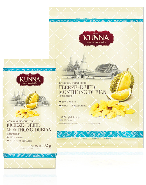 每一片KUNNA都使用了泰国最优质的金枕头榴莲,每一片都是厚实的榴莲果干而不是混合水果干。KUNNA只选取成熟的金枕头榴莲,来保证远超其它品牌的最佳口感。