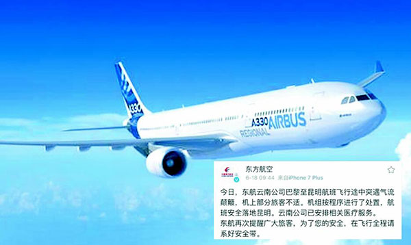 “东方航空”官方微博昨天发布消息:“今日,东航云南公司巴黎至昆明航班飞行途中突遇气流颠簸,机上部分旅客不适。机组按程序进行了处置,航班安全落地昆明。云南公司已安排相关医疗服务。”