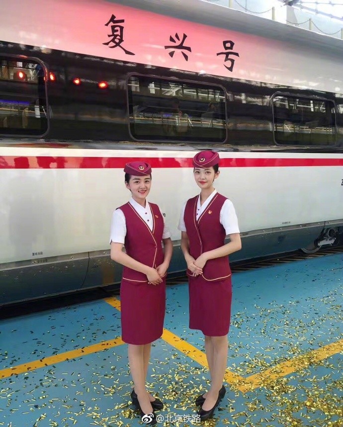 首发值乘任务的北京客运段工作人员与“复兴号”合影。