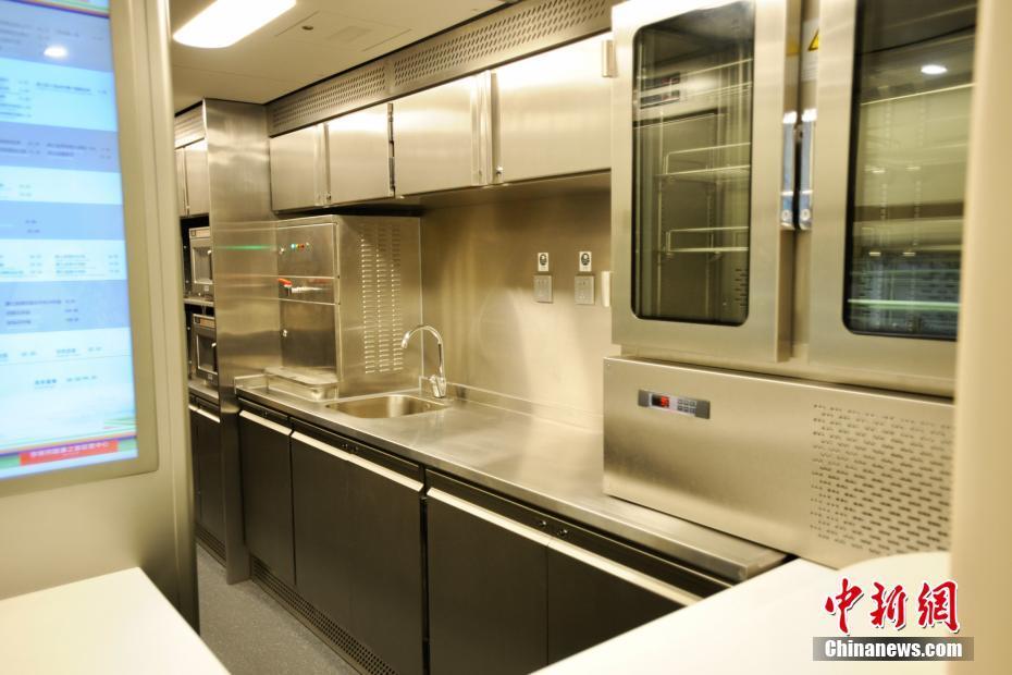 “复兴号”将率先在京沪高铁两端的北京南站和上海虹桥站双向首发,分别担当G123次和G124次高速列车。图为“复兴号”高铁餐车。