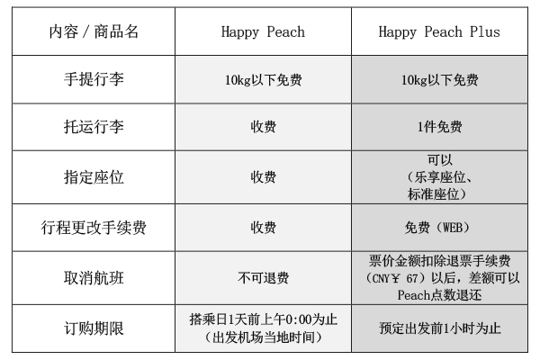・ 「Prime Peach」可以接受两个托运行李,免费指定第一排以外的座位