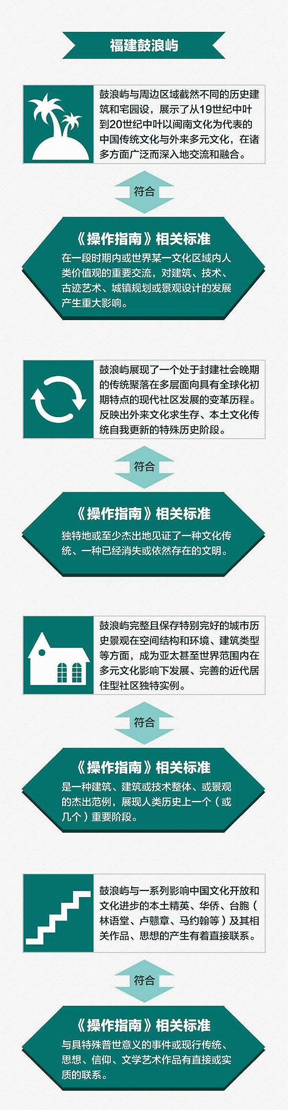 其中针对文化遗产的标准共有6条。据央视新闻报道,鼓浪屿符合其中的多项标准。