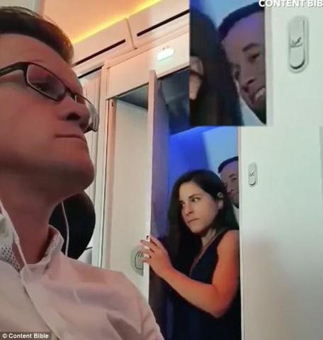 据英国《每日邮报》7月7日报道,本月4日那天,在英国维珍航空公司一架从伦敦飞往美国迈阿密的航班上,一名坐在厕所附近的乘客,无意间拍到令人耳红心跳的一幕:一名年轻女子从厕所里出来,其身后却有一张男人的脸露出来,还面带微笑,眉宇间一幅满足的神情。