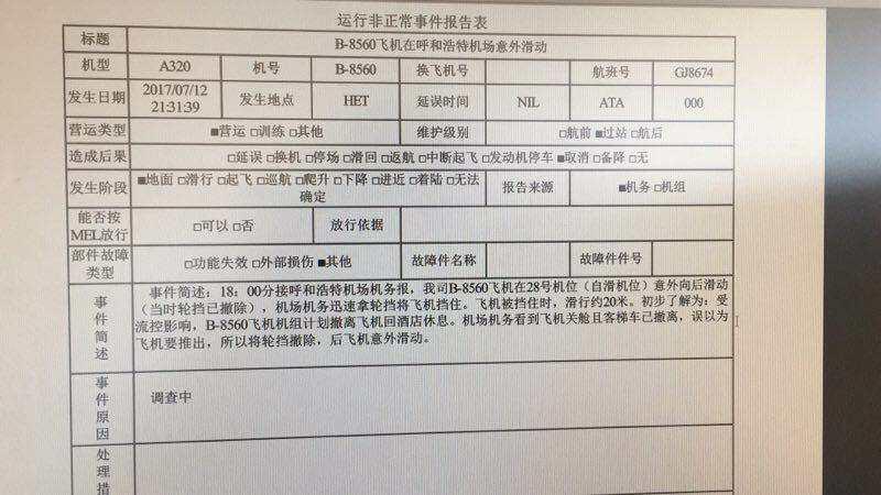 据知情人士提供给鉴闻的一份“运营非正常事件报告表”,该事件初步定性为“意外滑动”。“18:00分接呼和浩特机场机务报,我司(笔者注:长龙航空)B-8560飞机在28号机位(自滑机位)意外向后滑动(当时轮挡已撤除),机场机务迅速拿轮挡将飞机挡住。飞机被挡住时,滑行约20米。”报告表中“事件简述”一栏写道,“初步了解为:受流控影响,B-8560飞机机组计划撤离飞机回酒店休息。机场机务看到飞机关舱且客梯车已撤离,误以为飞机要推出,所以将轮挡撤除,后飞机意外滑动。”