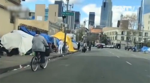 赴美游客张小雷说,就是这条街往这个方向走,大概走四五条街吧。然后向右拐,我印象中是这样,然后我就看到一个区,环境非常差,也没有高楼,两边都是很矮的房子。两边非常脏,路两边都是帐篷,坐着很多像难民一样的人,全部是黑人。我就比较好奇,我就在路口拍了个照,我就想了一下,我觉得有点不安全的感觉。但是出于旅游者的好奇心,我还是走进去了。