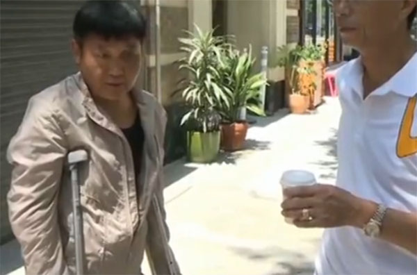 张先生左腿骨裂只能拄拐。