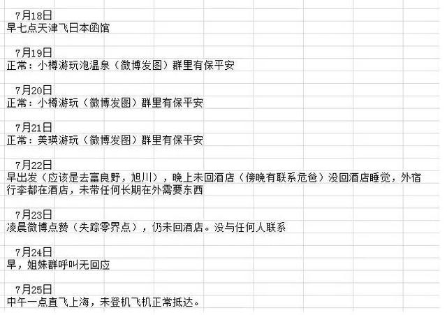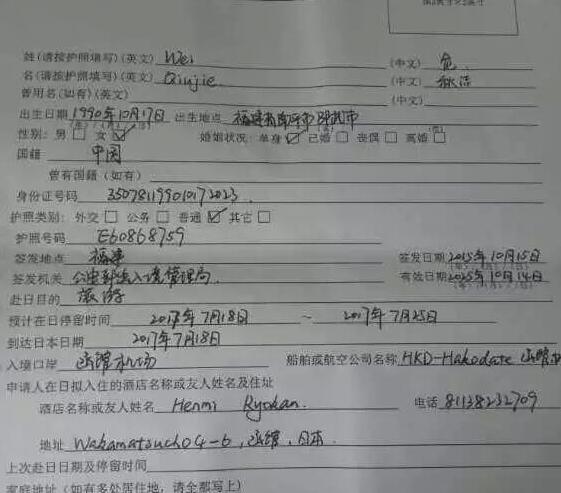 危秋洁的弟弟介绍说,本月18号,姐姐独自一人从福州出发,经由天津飞往日本北海道旅游。从危秋洁填写的签证申请表也可以看出,她在日本的行程,从7月18日至7月25日一共8天。
