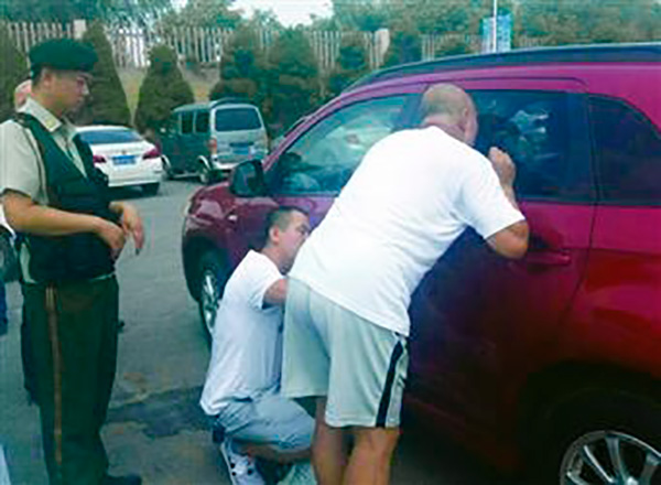 7月30日上午10时许,葫芦岛市望海寺边防派出所接到报警,称有一对游客在望海寺海边游玩把孩子锁在车里,后回来发现车门打不开。接到报警后,派出所教导员贾亮、副所长王晓龙带领两个民警带上一把圆头锤子火速赶往现场施救。与此同时,民警一边与119联系,一边和开锁师傅联系。