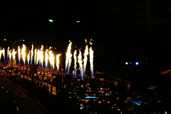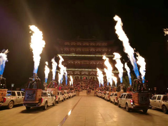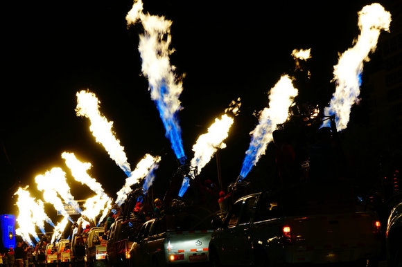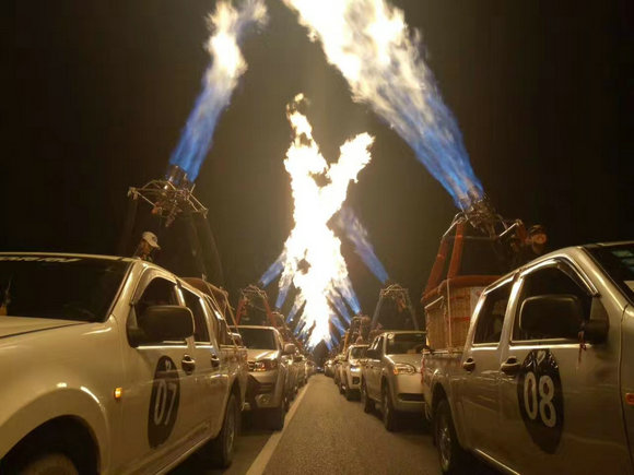 7月30日晚,“梦想承载器”在安宁区点亮,全程10.4公里的喷火游行盛大举行。游行场面十分壮观,30辆皮卡车沿街排成长龙,从七里河黄河大桥出发,沿黄河驶向莫高大道,燃烧器随着音乐的节拍喷火,喷射火焰高达5米,伴随着巨大的声响,把夜空照亮,整条街道恍如白昼,全民沸腾,最终回到主会场中央商务区结束。