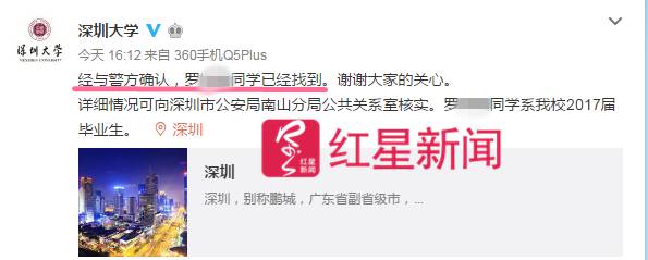 8月1日下午,上午还在发文寻找罗某的深圳大学官方微博发文称:罗同学已经找到。