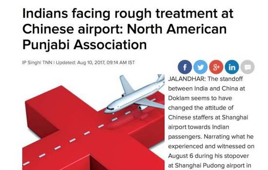 “印中在洞朗地区的对峙看来已经令中国机场工作人员对印度乘客的态度发生变化”,《印度时报》10日报道称,印度裔的北美旁遮普人联合会执行董事查哈尔日前致信印度外交部长斯瓦拉吉,讲述了他在上海浦东机场所遭到的“不公正待遇”,并要求印方就这一事件同中方交涉,以及发布一项公告,提醒印度乘客在乘坐国际航班时避免途经中国。《环球时报》记者11日致电涉事的中国东方航空公司。该公司表示,正在调查核实具体情况。