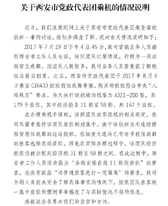@中国南方航空 8月12日12时发布《关于西安市党政代表团乘机的情况说明》,如下: