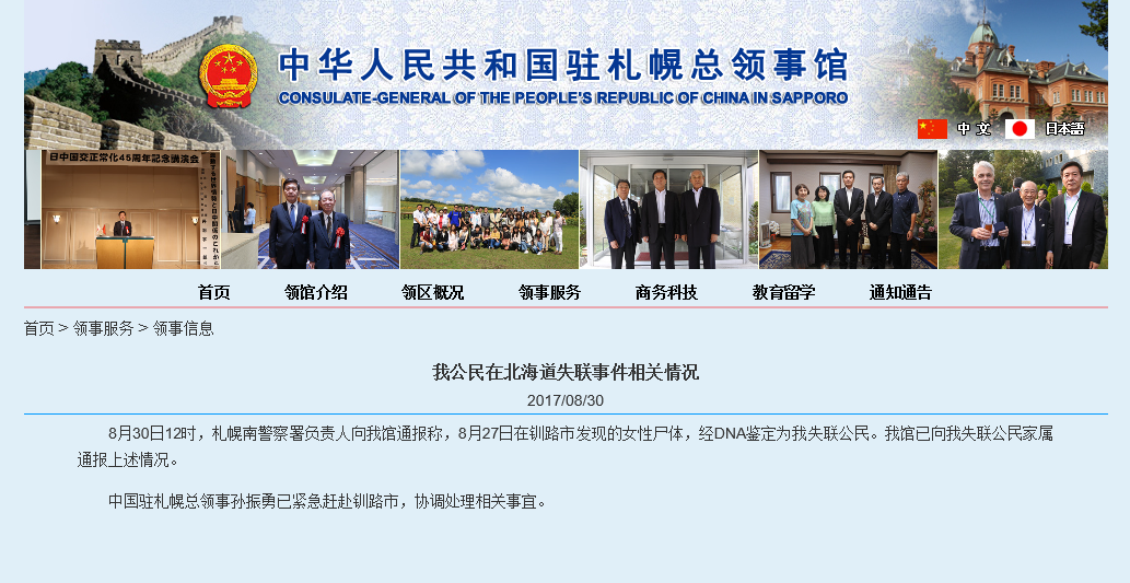 中国驻日本札幌总领馆发布消息,在日本北海道海滩发现的遗体,经DNA鉴定确认系中国福建失联女教师危秋洁。死因为溺水。危秋洁弟弟向搜狐号“知世”表示,其父亲明天将抵达日本。之后的具体情况,需要等日本警方和领事馆发布。