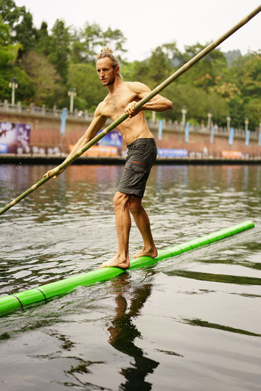 朱利安•米洛笑着说:“因为我们都是运动员,身体的平衡性很好,所以学这个对于我们来说不算难。但是,第一次玩独竹漂,感觉很新鲜,很有趣。”