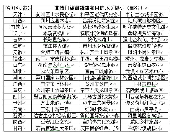 总有些美景在我们意想不到的地方。一些新兴的旅游线路和目的地未受到较多关注,部分热门的旅游线路和目的地进入相对淡季,在假日期间选择前往将大大提升旅游的品质,丰富旅行的内涵。为方便广大游客,部分省(市、区)旅游主管部门根据历年同期假日旅游情况,整理了一份非热门旅游线路和目的地关键词,以供参考。