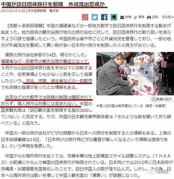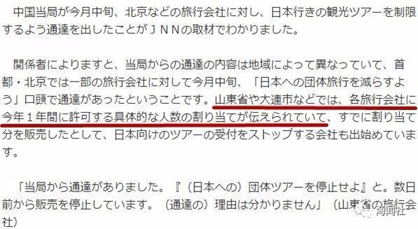 TBS电视台的报道称,本月中旬,中国政府对旅行社发出了相关通知。各地情况各不相同,北京一些旅行社被口头通知“请减少赴日团体游数量”。而在山东、大连等地,各旅行社发团人数被限额,一些已经把一年内额度销售完毕的旅行社,甚至不再发团。关于原因,报道称还不清楚,猜测是为了防止资本流向海外。