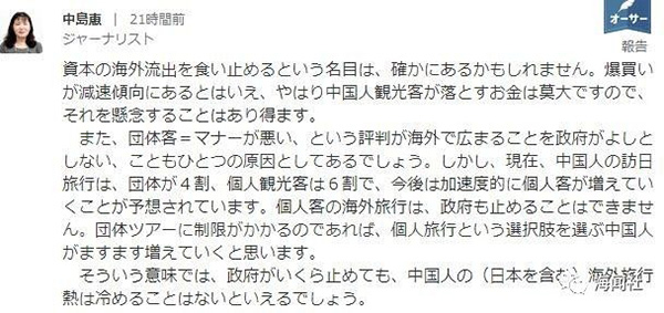 在网友的评论中间,还有日本知名记者中岛惠对此事的看法: