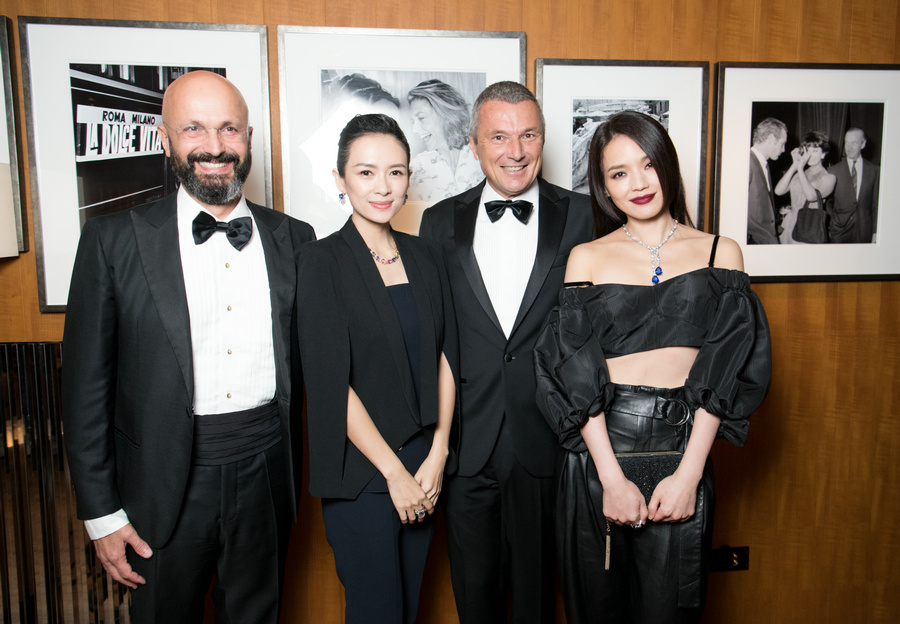宝格丽品牌代言人舒淇、宝格丽集团首席执行官Jean Christophe Babin、著名影星章子怡、宝格丽集团执行副总裁Silvio Ursini亮相北京宝格丽酒店开幕晚宴(从右至左)