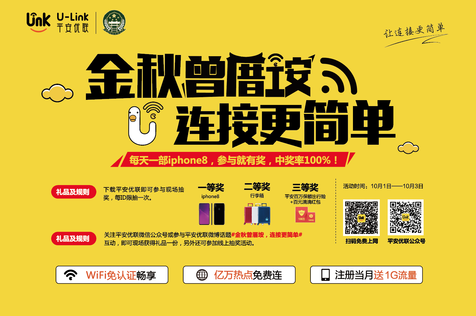 双节将至,平安讯科打造#金秋曾厝垵,链接更简单#线上、线下主题活动,10月1日至10月3日期间,下载平安优联即可参与曾厝垵景区现场幸运抽奖活动,每天送出一部iphone8,此外更有惊喜大礼神秘奉送,中奖率高达100%!活动详情请关注平安优联微信公众号或参与平安优联微博话题#金秋曾厝垵,链接更简单#进行互动。