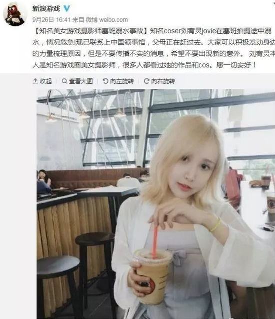 9月25日,新浪游戏官方微博:知名coser@刘宥灵jovie在塞班拍摄途中溺水,情况危急!现已联系上中国领事馆,父母正在赶过去。刘宥灵是知名游戏圈美女摄影师,很多人都看过她的作品和COS(注:COS,Costume的缩写,指模仿装扮虚拟世界的角色,也被称为角色扮演。Coser,玩COS的人一般被称为coser)。