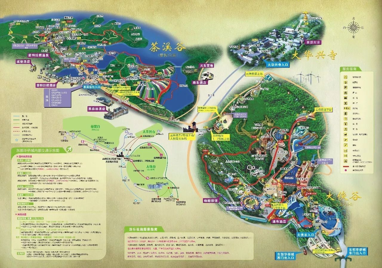 [顺序依次为:1.大侠谷入口→2.大侠谷瀑布→3.海菲德小镇→4.发现广场→5.6D影院→6.木质过山车→7.咆哮山洪→8.云海索道→9.云中漫步→10.云霄飞轮→11.登峰造极→12.观光塔→13.丛林缆车1号线→14.童趣乐园→15.火鸟山谷→16.丛林穿梭→17.森林广场→18.激流勇进→19.水公园→20.大梅沙狂欢节夜场表演]