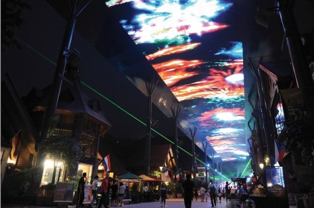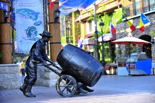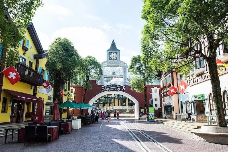 顺着路走经过一个拱洞,就来到了3.海菲德小镇的浪漫世界了,欧式风情建筑、啤酒屋、海菲德舞演,还有着长120米宽18米的天幕,值得走走。