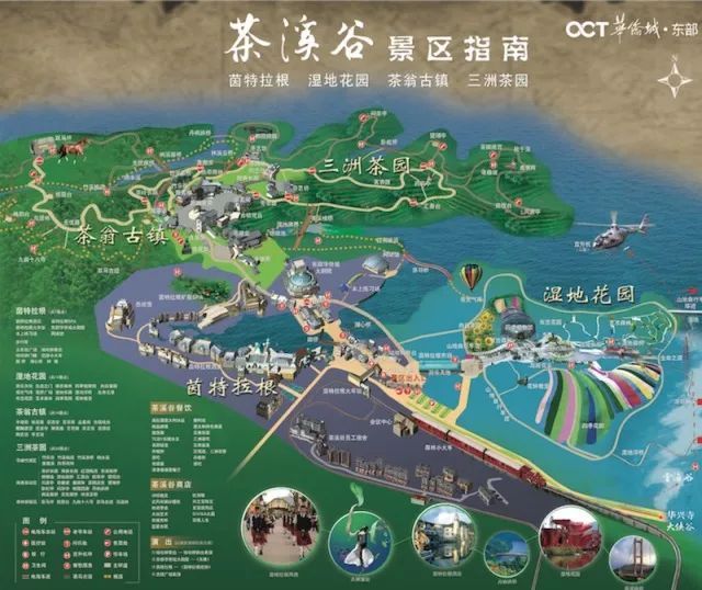 [顺序依次为:1.茶溪谷入口→2.四季花田→3.四季植物馆→4.茵特拉根市场→5.茵特拉根小镇→6.水上高尔夫→7.茶艺坊→8.茶翁古镇→9.茶溪栈桥→10.庚子首义纪念馆→11.童趣溪→12.竹乐谷→13.半坡街→14.《天禅》→15.森林小火车→16.咕咕钟舞台]