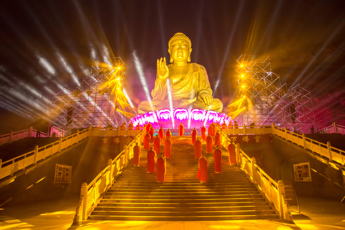 十一当晚,景区还以伊山大佛及石佛寺的历史文化内涵为主题,邀请江苏尔目文旅集团的专业导演,策划演出团队,融合音乐、道具、布景、灯光于一体,运用现代高科技演出手段,营造出佛光普照的神圣庄严意境,点亮了大伊山石佛寺“镇寺之宝”的亚洲最高锻铜制坐佛伊山大佛。一场由小沙弥开场,30位高僧大德及近百名居士共同完成的佛光艺术表演,将大伊山石佛寺深厚的历史文化,浓缩于极具科技感的“时光隧道”展演之中。