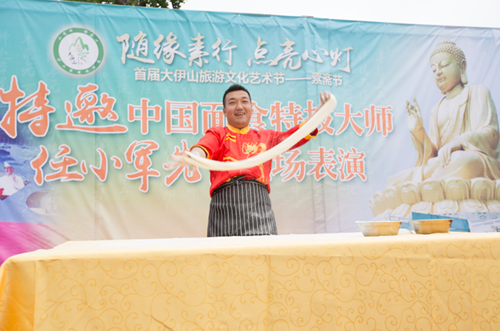 本次艺术节以“随缘素行 点亮心灯”为主题。开幕式上,景区邀请到了山西“面食大咖”任小军现场制作“超级长寿面”,现场近百名游客排队传递这跟长寿面并将其下入汤锅,共食长寿面,将健康美好的祝愿共同传递。除了这跟“超级长寿面”,节庆上还布置了佛禅文化休闲长廊和室内餐厅,集中展销超过30种内地以及境外素食名小吃,并融入灌云美食特色,供游客休息品尝,实现健康体验,快乐旅游。同时,十一期间来大伊山游玩的游客,还能凭门票领取素斋小吃券和特制福袋,让吉祥好运伴随假日时光。