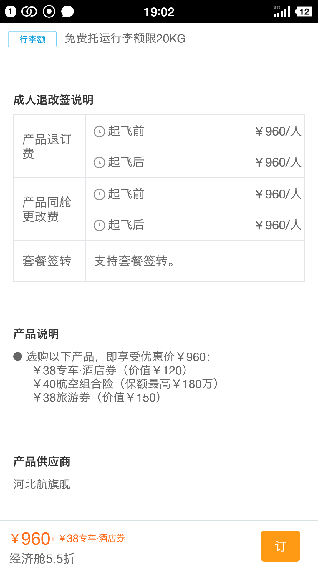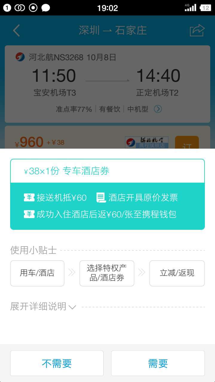 与投行老范文中所选一致,记者选中了河北航空执飞的深圳至石家庄的NS3268航班。携程提供该航班的多种票务,经济舱价格从960元到1200元不等。其中,最便宜的960元套餐包含价值38元的专车和酒店抵用券。