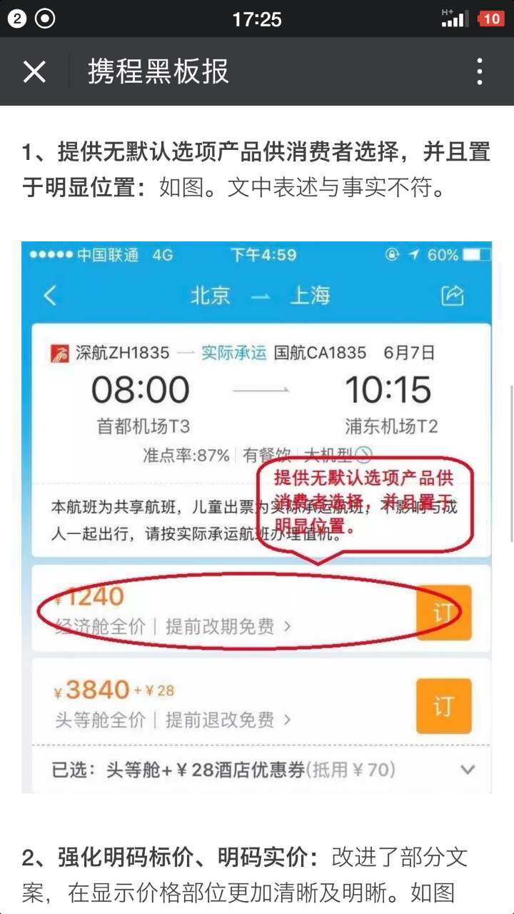 在题为《关于公众号诽谤携程的相关说明》中,携程罗列多张在其APP上预定机票的截图,表示其“提供无默认选项产品供消费者选择,并且置于明显位置”,“强化明码标价、明码实价”、“结算确认及成交后双重提示消费者”,并“开通增值服务退订通道”。