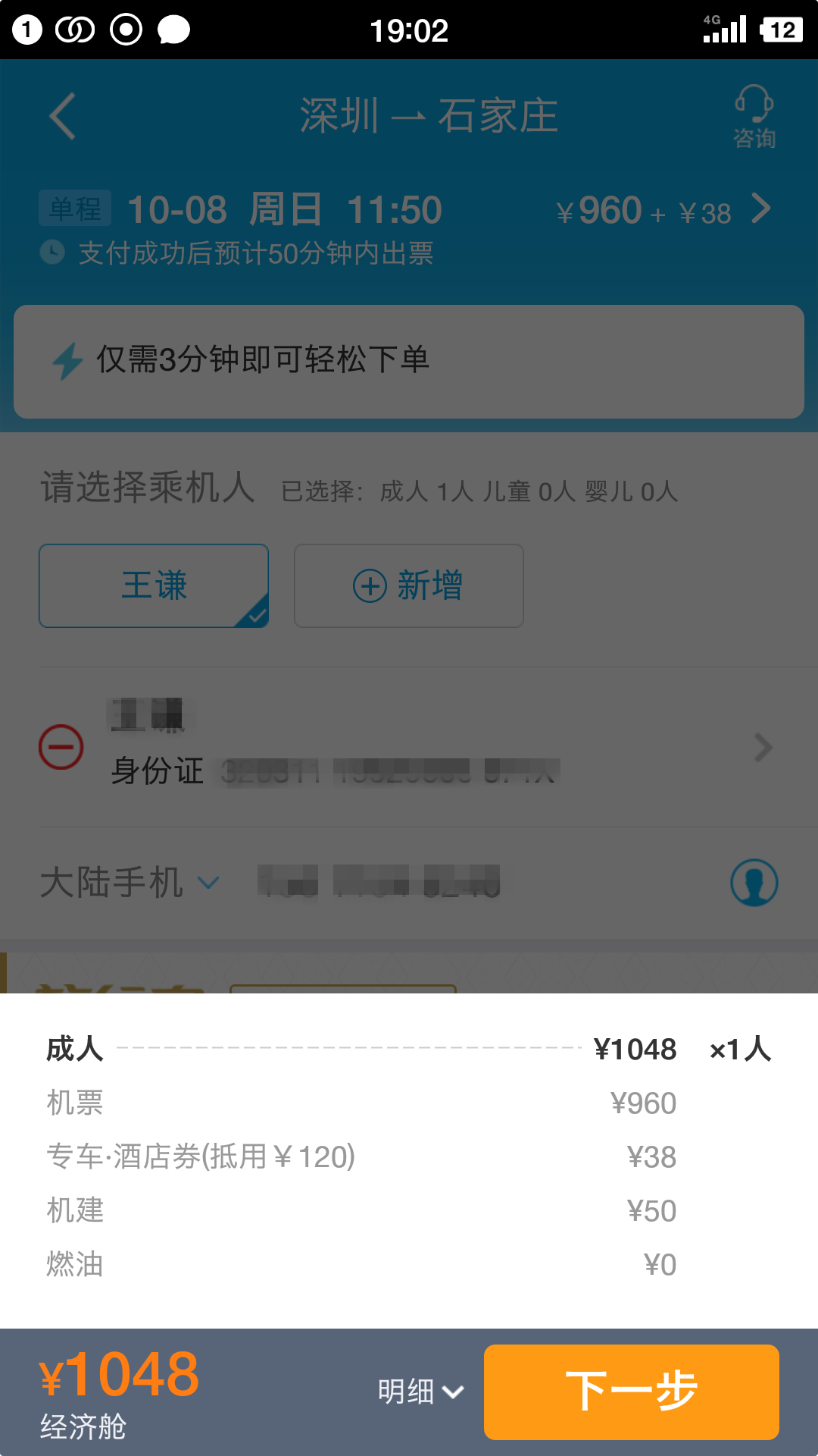 一路操作下来,在支付订单时,总价为1048元,展开明细,可以看到价格由960元的机票、38元的专车和酒店抵用券和50元的机场建设费组成。