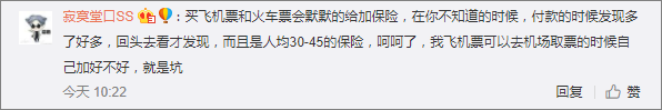 另一位网友@寂寞堂口SS 表示,“买飞机票和火车票会默默的给加保险,在你不知道的时候,付款的时候发现多了好多,回头去看才发现,而且是人均30-45的保险”。