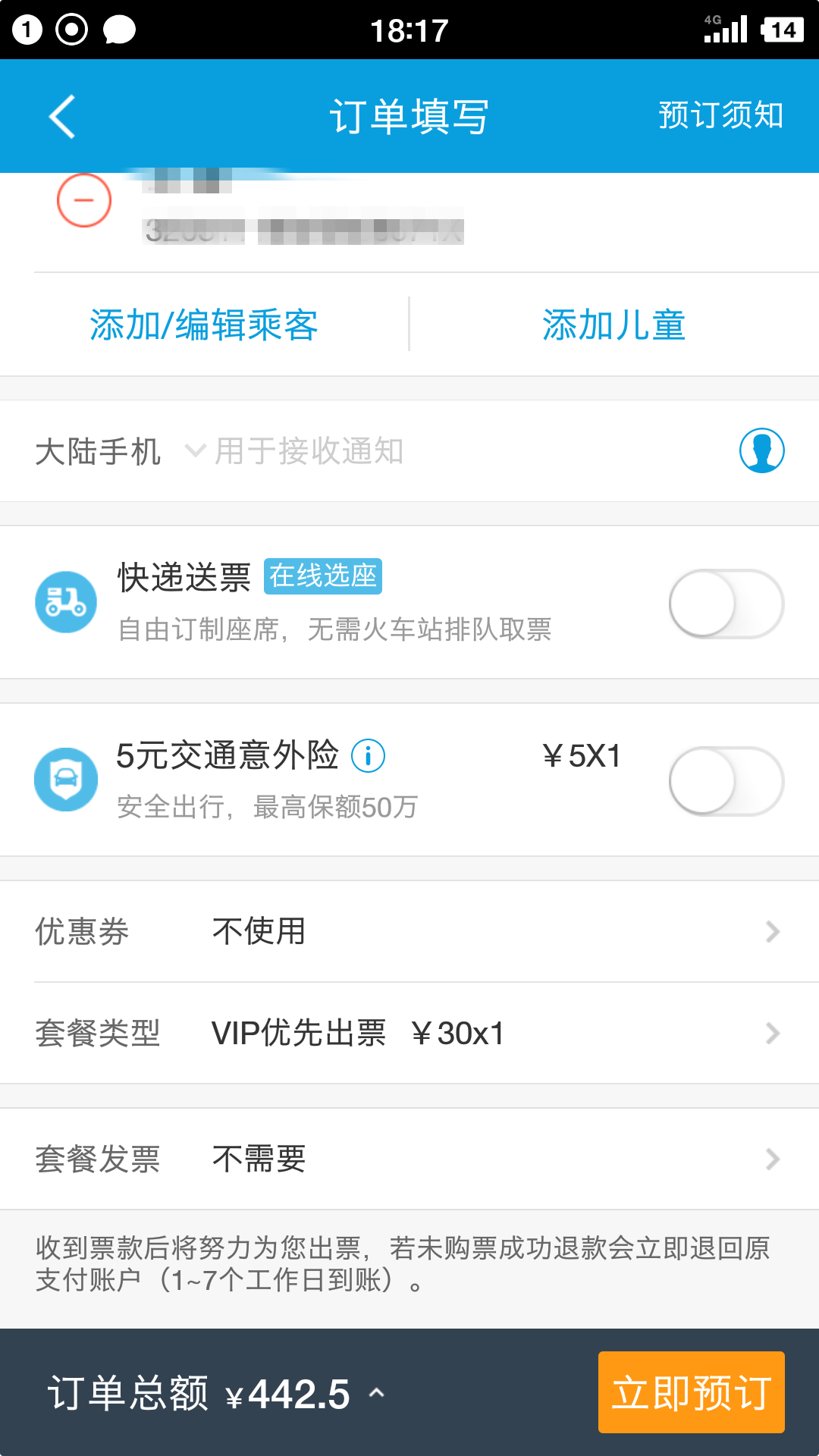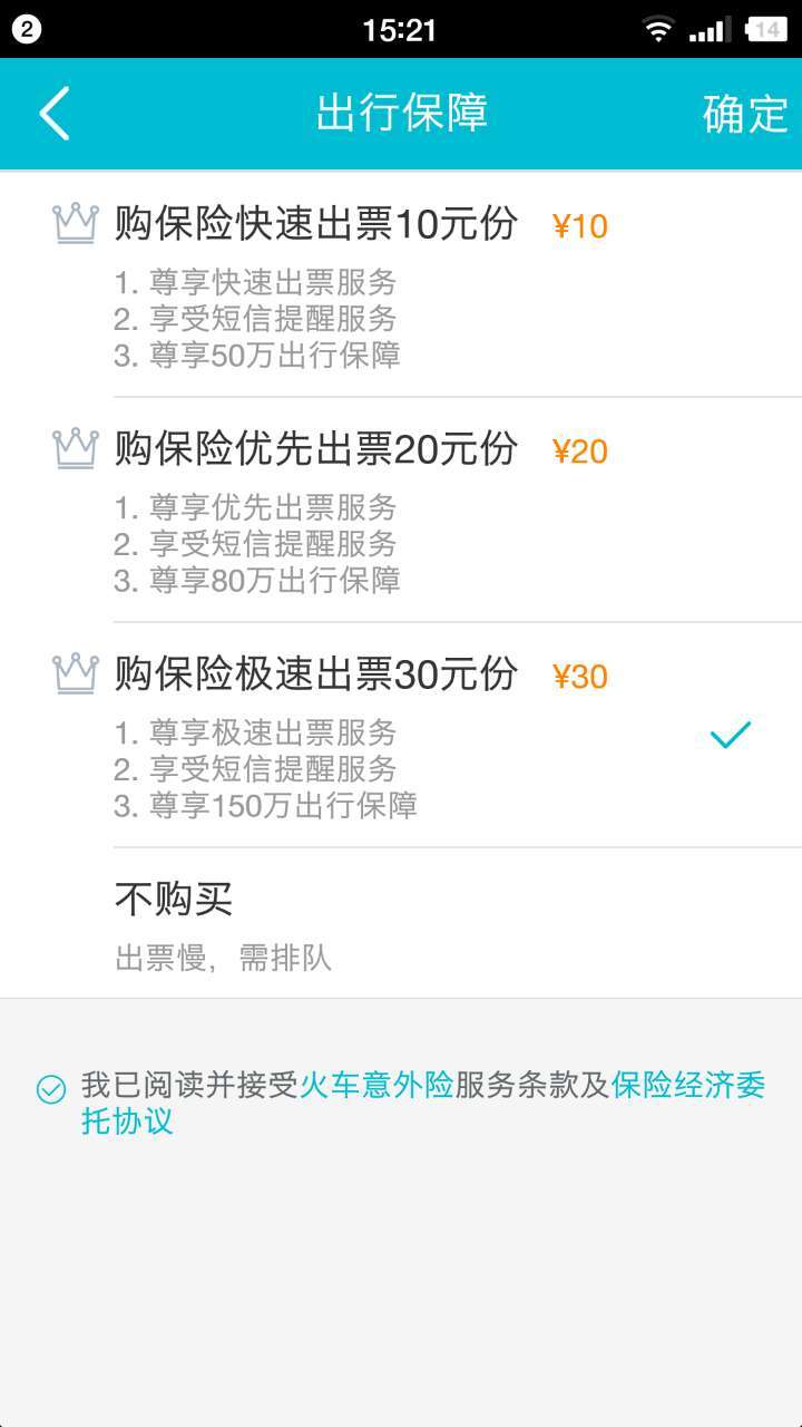 默认选项包含价值30元的”VIP极速出票“。图片来源:携程客户端