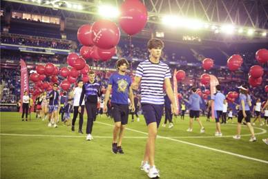 随着酷炫的镭射show全场游走,近百位欧洲模特齐聚球场中线。紧接着全场亮灯,所有模特分成四组,在旗手的带领下,首个中国品牌在足球赛场的时装走秀正式开始。