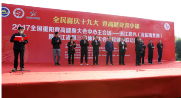 山东沂蒙山、广西平天山、兰州九州台、陕西华山、广东罗浮山、浙江江山、湖南黑麋峰、海南七仙岭、河南鸡公山、新疆天山天池、江西梅岭、内蒙古苏木山、辽宁千山、吉林长白山、河北联峰山、重庆金佛山、北京八达岭古长城、河北山叶口、云南珠江源、陕西骊山等近30 个分会场同时联动,达到近十万群众重阳节登高健身的壮观场面。活动以“全民喜庆十九大、登高健身奔小康”为主题,由老、中、青、少各年龄段健身爱好者共同参加。当天,嘉兴市共组织19000人开展重阳登高系列健身活动,其中中心主会场组织1900人参与活动。