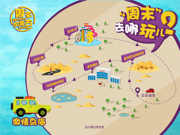 推荐线路:“周末内蒙古”出发城市——金沙湾——蓝梦酒店——乌海湖——乌兰布和沙漠——蒙根花