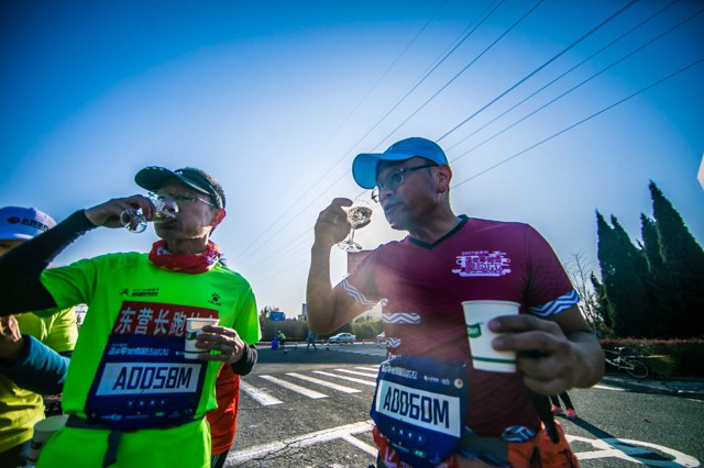 “等会儿,我再喝两杯!”来自龙口的一名跑友,在赛道补给站,端起酒杯,招呼着跑伴。