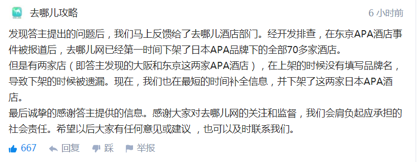 近两日在网上闹得沸沸扬扬的APA酒店“重现事件”有了新转机。记者在13日16时许登录知乎,发现去哪儿驻知乎官方账号“去哪儿攻略”在知乎答主王瑞扬回答下方的评论区回应道,经排查,在东京APA酒店事件被报道后,去哪儿网已第一时间下架了日本APA品牌下的全部70多家酒店,但有两家店(即答主发现的大阪和东京这两家APA酒店)在上架时没有填写品牌名,导致下架时被遗漏。现在,去哪儿网已经补全信息,并下架了这两家酒店。