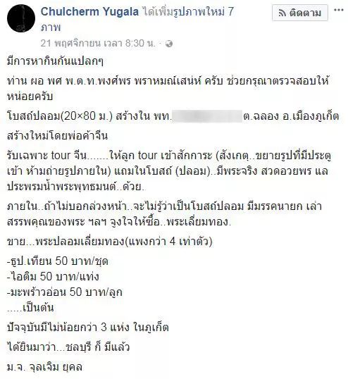 จากกรณีผู้ใช้เฟซบุ๊ก “Chulcherm Yugala” ได้โพสต์ข้อความเกี่ยวกับการสร้างโบสถ์ปลอม ในพื้นที่วัดลัฎฐิวนาราม (วัดใต้) ต.ฉลอง อ.เมือง จ.ภูเก็ต เพื่อรองรับทัวร์จีนเข้าไปสักการะ รวมทั้งภายในโบสถ์ยังมีพระนั่งสวดมนต์ให้พร ประพรมน้ำพระพุทธมนต์ มีมรรคยกทำหน้าที่เล่าสรรพคุณของพระเครื่อง เพื่อจูงใจให้นักท่องเที่ยวจีน เช่าไปบูชา พระปลอมเลี่ยมทองในราคาที่แพงกว่าท้องตลาดถึง 4 เท่า