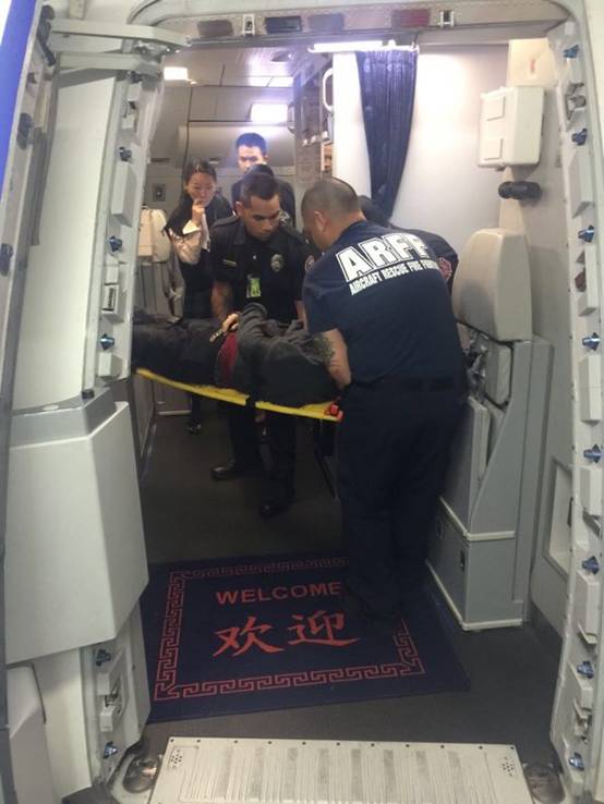 当晚11时,东航洛杉矶营业部塞班站接应急保障指示后,立即上报北美营销中心,中心指示全力配合总部做好备降航班的应急处置,务必确保患者生命安全。塞班站随即致电代理着手安排接机人员,并联系机场塔台一关三检和救护车到场。MU727于北京时间25日00:08落地塞班机场,随后急救人员立即登机,用担架将病人抬出客舱送往市中心的医院就诊。