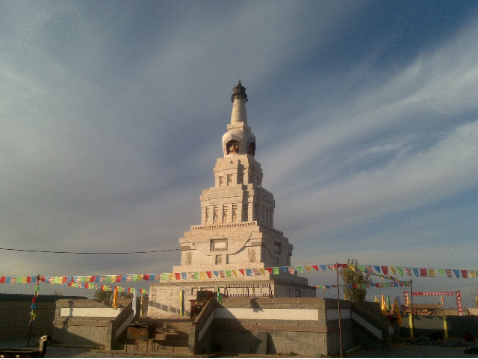 经缘寺,俗称于胡硕庙,位于大沁他拉镇章古台村,距奈曼旗政府所在地10公里处,该塔原建于清乾隆年间,一九三七年东迁至胡硕庙朝克沁(大经堂)西侧偏北,并如前制扩尺一倍的规模,按原造型重建。由去五台山朝拜途经奈曼的一个喇嘛(通晓建筑)负责重建监修之责。共沿革历史建成近300年,重建后历史68年,现存白塔一座,为自治区级文物古迹。该塔又是以胡硕庙为代表的奈曼二十四座失存寺庙的重要的历史见证。