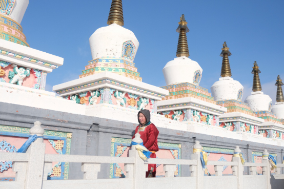 透过水汽凝结而朦胧的窗,看着大地由枯黄到点点白霜。到达了今天的目的地浩勒图庙,此时天地已是一片银装素裹。从纯净的天,到天边的云,到云下的山,到山前的雪,都是淡淡的白,让人仿佛置身于梦境。就是在这简简单单的白色背后,潜藏的最圣洁的信仰。